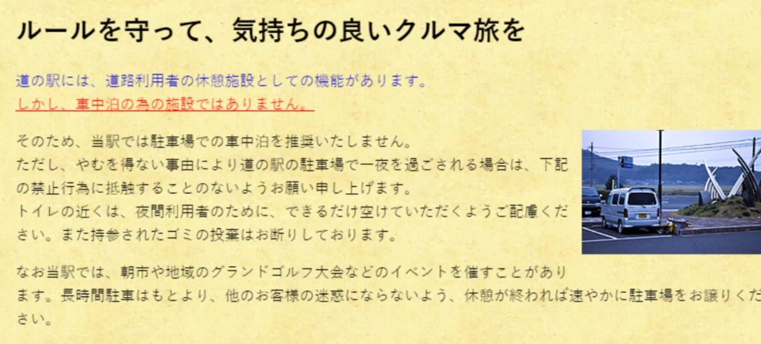 「道の駅」は、誰もが24時間いつでも安心して休憩・仮眠ができる大切な場所です。私は、ドライバーの皆様が休息をためらってしまうような「車中泊禁止」などの独自ルールを改善するため、国や自治体、各道の駅との対話を大切に重ねてきました。その結果、国土交通省からも「車中泊禁止や長時間駐車の禁止といった、休憩を妨げる表現は不適切である」との正式な確認をいただくことができました。