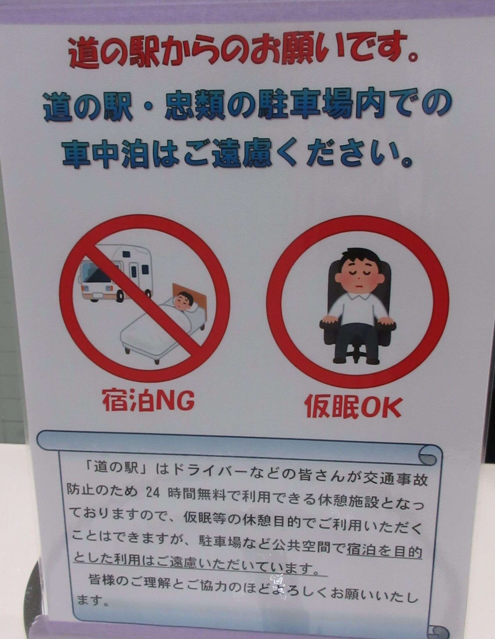 「道の駅」は、誰もが24時間いつでも安心して休憩・仮眠ができる大切な場所です。私は、ドライバーの皆様が休息をためらってしまうような「車中泊禁止」などの独自ルールを改善するため、国や自治体、各道の駅との対話を大切に重ねてきました。その結果、国土交通省からも「車中泊禁止や長時間駐車の禁止といった、休憩を妨げる表現は不適切である」との正式な確認をいただくことができました。